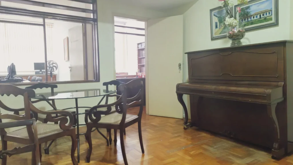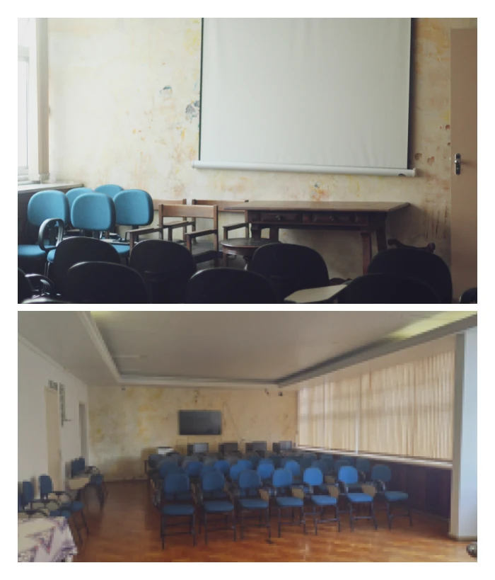 Nesse espaço contamos com uma mesa grande de reuniões e mais de 8 cadeiras, também tem um espaço para fazer exposição ou reproduzir diapositivas.